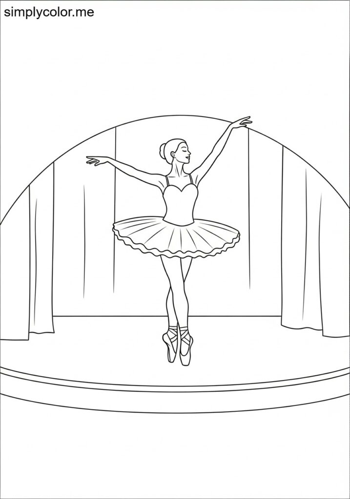 Let your little artist bring this graceful ballerina to life! Our printable coloring page captures the magic of a ballet performance on stage. Just download, print, and let the coloring fun begin. Perfect for sparking creativity and a love for dance!