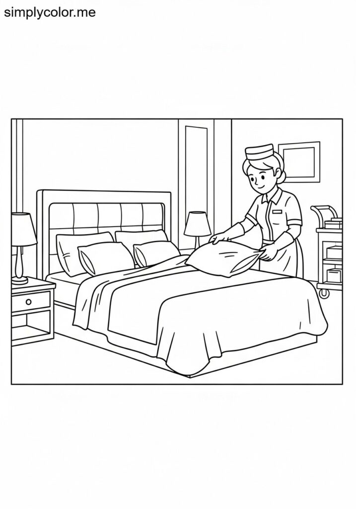 • A housekeeper makes a hotel bed printable coloring page for kids